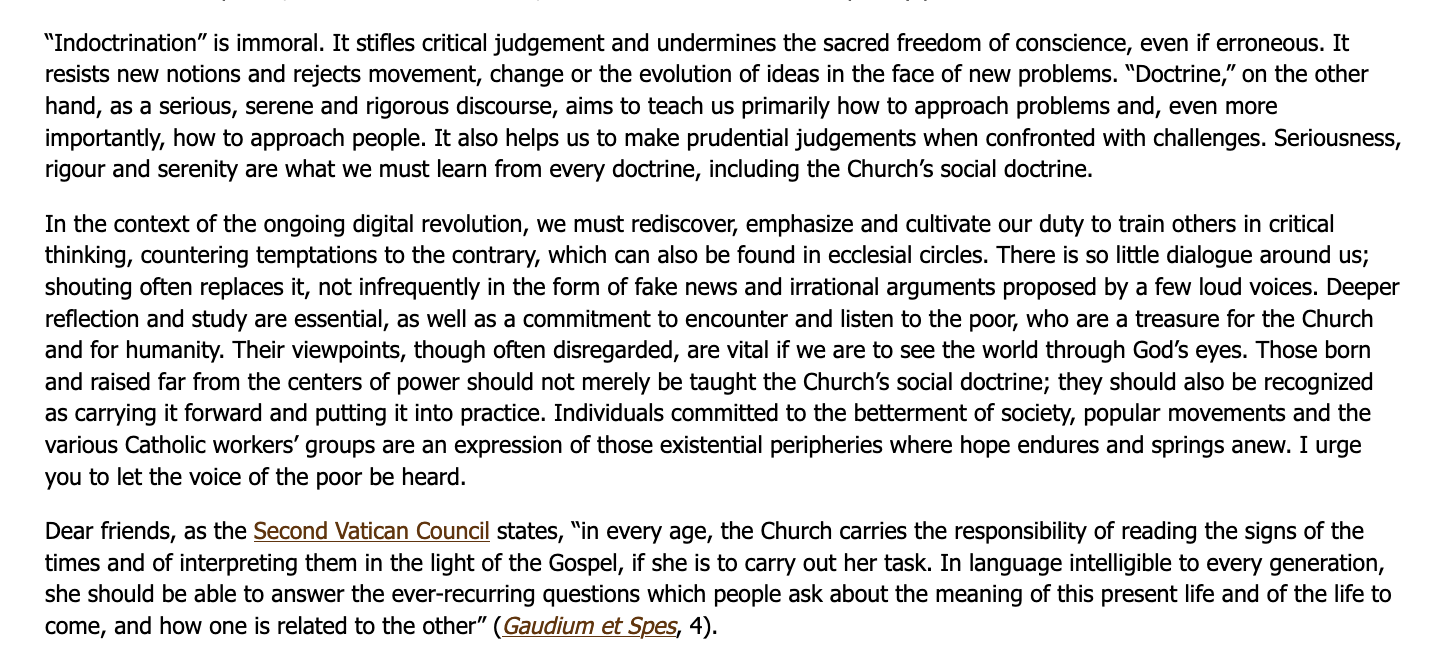 «Chi nasce e cresce lontano dai centri di potere non va semplicemente istruito nella Dottrina Sociale della Chiesa, ma riconosciuto come suo continuatore e attualizzatore: i testimoni di impegno sociale, i movimenti popolari e le diverse organizzazioni cattoliche dei lavoratori sono espressione delle periferie esistenziali in cui resiste e sempre germoglia la speranza. Vi raccomando di dare la parola ai poveri».