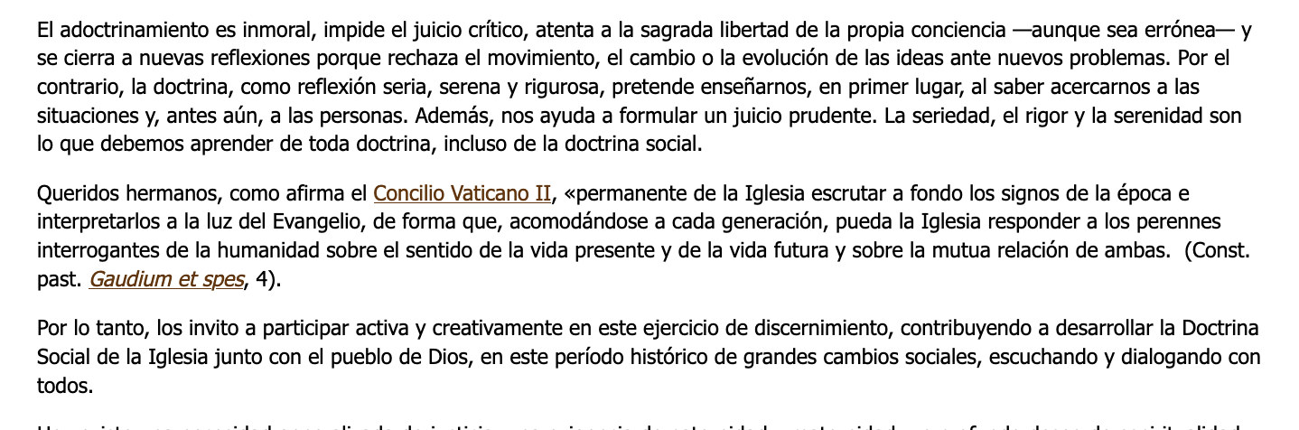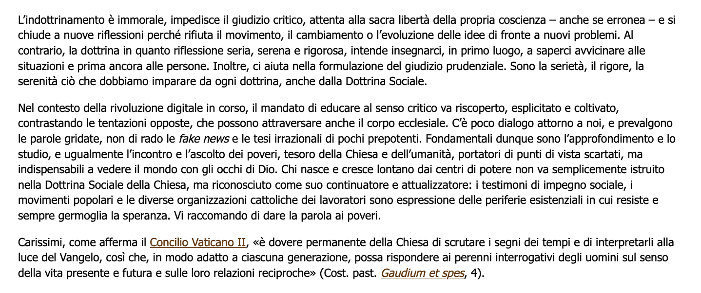 Una riflessione chiara, articolata e coerente con l’eredità del magistero sociale della Chiesa, rivolta peraltro all’associazione Ecclesiale che porta il nome di un’enciclica di Giovanni Paolo II, pensata dal papa polacco per celebrare l’anniversario secolare della Rerum Novarum, l’enciclica di Leone XIII al quale Papa Prevost ha esplicitamente detto di ispirarsi fin dalla scelta del nome pontificio. Questa frase, così netta nel dare peso alla questione sociale e ai movimenti cristiani che la mettono al centro, risulta appunto assente nella versione spagnola pubblicata sullo stesso portale vaticano. Il testo in castigliano omette integralmente ogni riferimento ai movimenti dei lavoratori e al sindacalismo cattolico, lasciando senza applicazione gli aspetti metodologici della Dottrina sociale: la distinzione tra dottrina e indottrinamento, l’importanza del discernimento, la lettura dei «segni dei tempi».