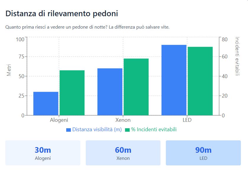 La differenza tra fari di qualità scarsa e buona può essere determinante: gli studi dimostrano che con fari scadenti un automobilista medio avrebbe tempo sufficiente per evitare circa il 46% degli incidenti notturni con pedoni, mentre con fari di buona qualità questa percentuale sale al 70%. I fari di nuova generazione – LED e Xenon – offrono una visibilità radicalmente superiore che permette di reagire prima, riducendo i rischi nelle strade affollate.