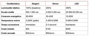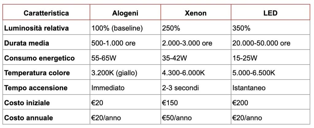 Come emerge dalla tabella, i LED offrono luminosità 3,5 volte superiore agli alogeni consumando un terzo dell’energia (15-25W contro 55-65W). Con 20.000-50.000 ore di durata coprono l’intera vita del veicolo, mentre alogeni e Xenon richiedono sostituzioni rispettivamente ogni anno e ogni 2-3 anni. Economicamente, i LED costano 200 euro iniziali ma solo 20 euro annui, come gli alogeni.